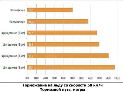 Испытания показали, что новые шипованные шины в плане эффективности торможения, бокового сцепления и разгона на обледенелом покрытии значительно превосходят фрикционные. Отличные результаты они продемонстрировали и на снежной дороге. Переломный момент наступает, когда глубина протектора достигает 6 мм. После этого тормозной путь фрикционных шин становится короче, чем у шипованных. И чем больше последние изнашиваются, тем менее эффективными они становятся по сравнению с нешипованным вариантом.