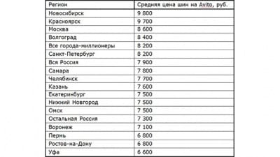 В России средняя стоимость шин на популярном сервисе Avito в октябре текущего года равнялась 7 900 рублям, в крупных городах с населением более миллиона человек – 8 200 рублям, а в других населенных пунктах цена составила 7 300 рублей. Самые высокие цены на резину отмечены в Новосибирске, Волгограде, Красноярске и в столице. В Уфе, Перми, Воронеже и Ростове-на-Дону их стоимость даже ниже среднего показателя по городам с населением до миллиона человек.